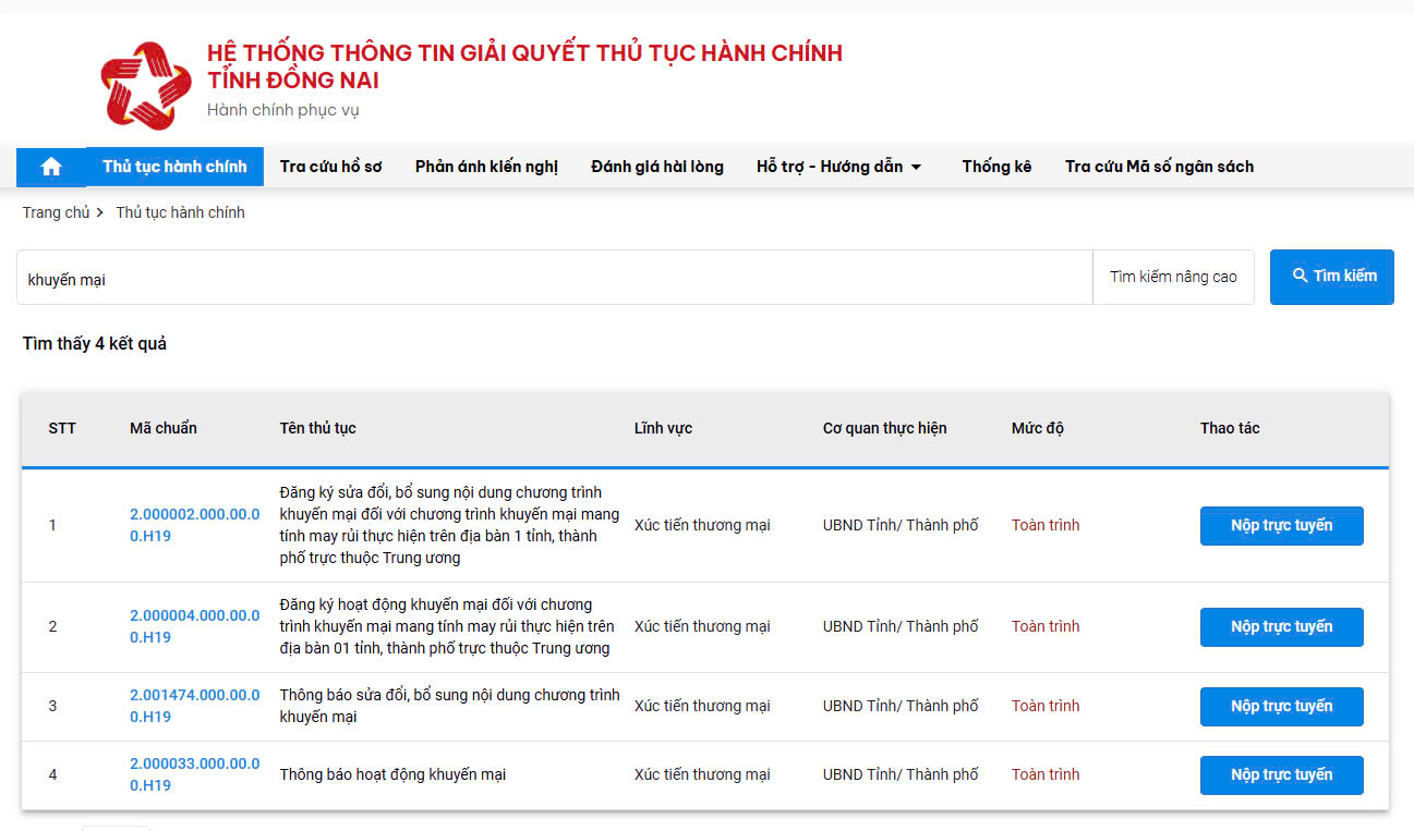 Hiện nay, Hệ thống thông tin giải quyết thủ tục hành chính của tỉnh ĐồngNai (Hệ thống mới) đã tích hợp các thủ tục hành chính về lĩnh vực khuyến mại của ngành Công Thương (04 thủ tục theo Phụ lục đính kèm).