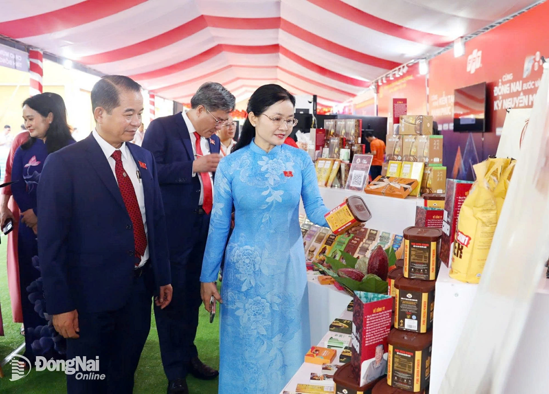 Lãnh đạo tỉnh Đồng Nai tham quan gian hàng trưng bày sản phẩm OCOP bên lề đại hội. Ảnh: Huy Anh
