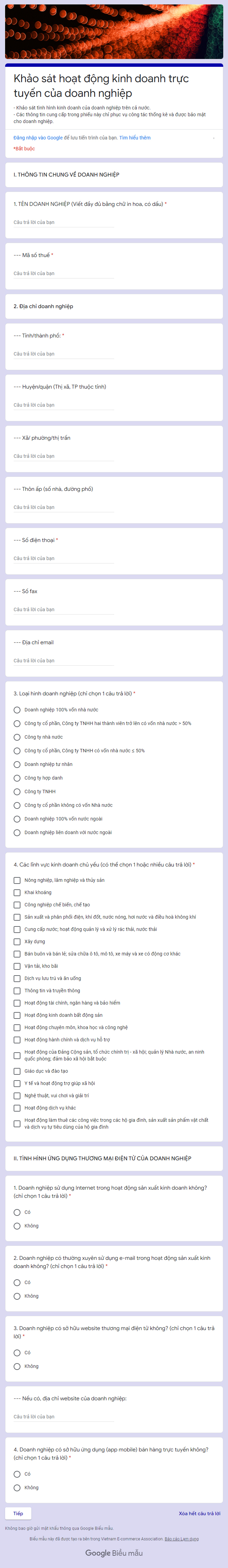 Sở Công Thương đã tạo biểu mẫu để thực hiện việc Khảo sát hoạt động kinh doanh trực tuyến của doanh nghiệp