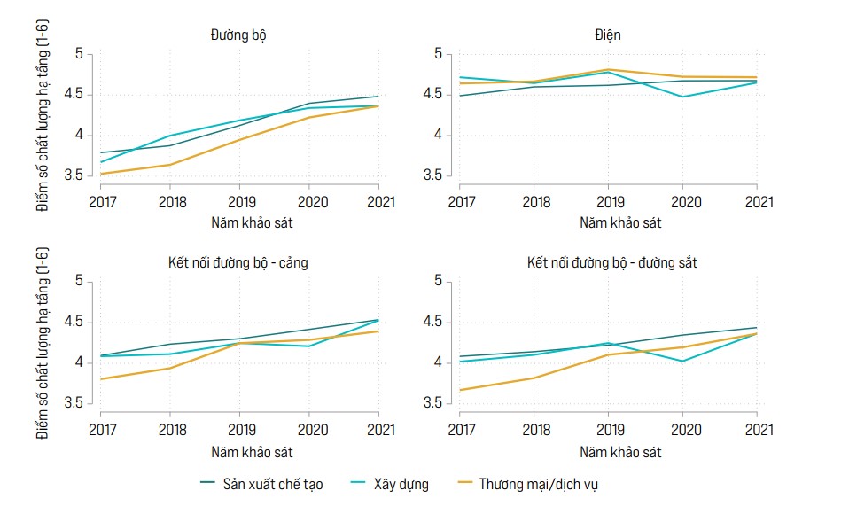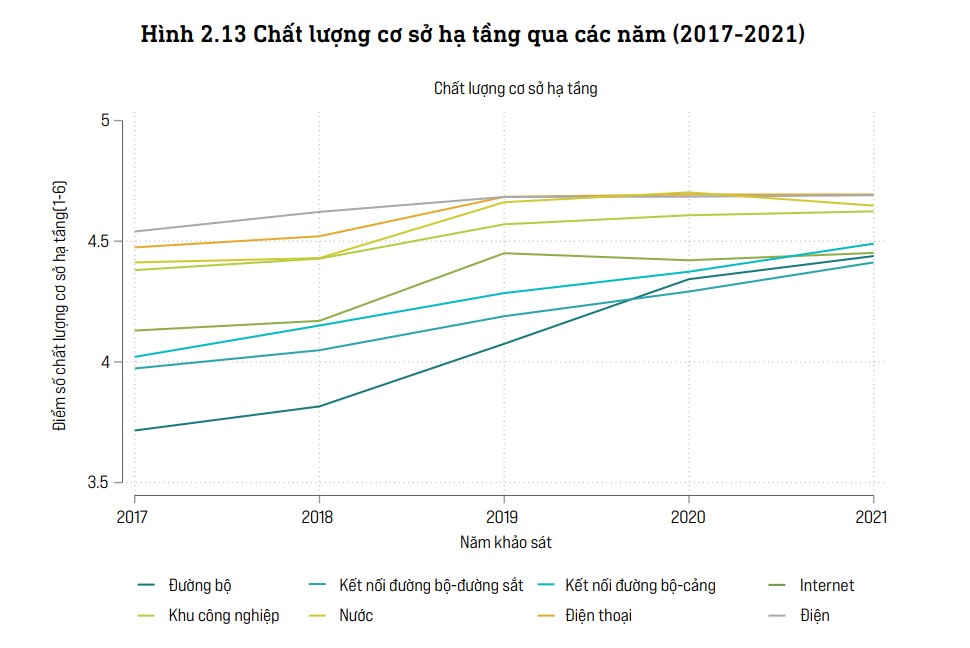 Các doanh nghiệp FDI tiếp tục đánh giá cao về lĩnh vực điện năng, trong đó các doanh nghiệp trong lĩnh vực dịch vụ, thương mại có đánh giá tích cực nhất cho yếu tố hạ tầng thiết yếu với hoạt động sản xuất kinh doanh này. Điện (4,69) và điện thoại (4,69) trên thang điểm 6, là hai lĩnh vực được các doanh nghiệp FDI đánh giá cao nhất trong năm 2021, đây cũng là hai lĩnh vực nhận được sự đánh giá tích cực của các doanh nghiệp trong nhiều năm qua.