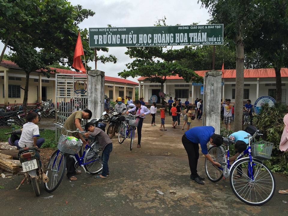 Các em học sinh trường Tiểu học Hoàng Hoa Thám sau khi nhận xe đạp