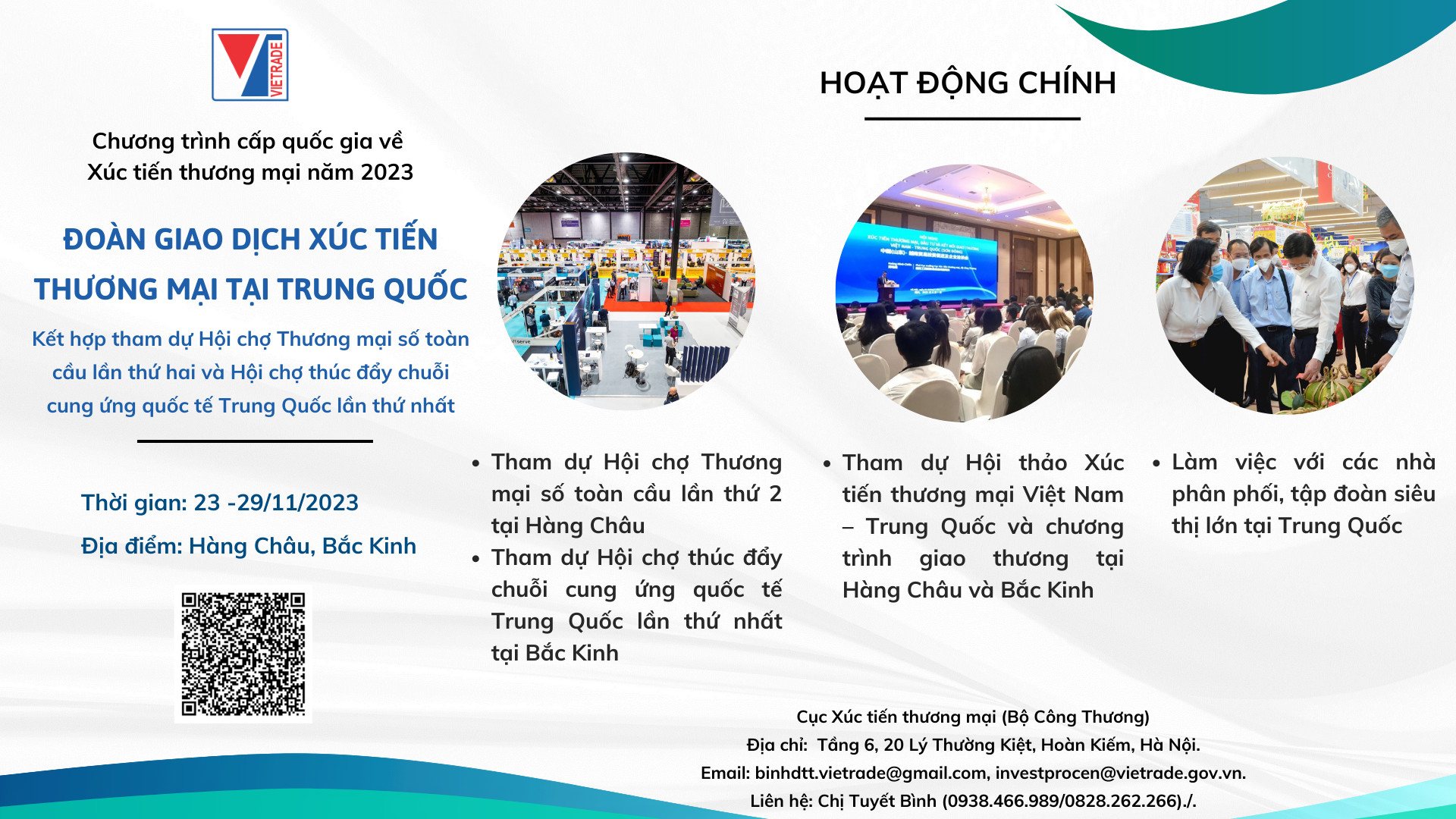 Thực hiện chủ trương của Bộ trưởng Bộ Công Thương về việc tăng cường hỗ trợ, phối hợp với các địa phương, doanh nghiệp Việt Nam nâng cao năng lực về kinh tế số, thương mại điện tử xuyên biên giới, tham gia hiệu quả chuỗi cung ứng toàn cầu, đặc biệt với thị trường Trung Quốc, Bộ Công Thương giao Cục Xúc tiến thương mại (XTTM) phối hợp với Thương vụ, Đại sứ quán Việt Nam tại Trung Quốc, Tổng lãnh sự quán Việt Nam tại Thượng Hải, Ủy ban Xúc tiến thương mại quốc tế Trung Quốc (CCPIT) và các cơ quan hữu quan tổ chức Đoàn Giao dịch xúc tiến thương mại tại Trung Quốc, kết hợp tham dự Hội chợ Thương mại số toàn cầu lần thứ hai tại Hàng Châu và Hội chợ thúc đẩy chuỗi cung ứng quốc tế Trung Quốc lần thứ nhất tại Bắc Kinh. Đây là hoạt động thuộc Chương trình Cấp quốc gia về xúc tiến thương mại năm 2023 đã được Bộ Công Thương phê duyệt tại Quyết định số 1923/QĐ-BCT ngày 26 tháng 7 năm 2023.