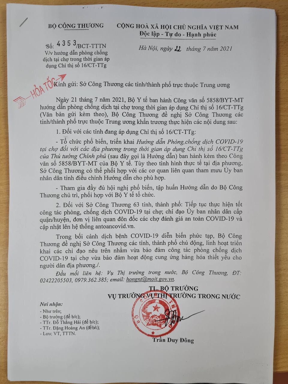 Thực hiện chỉ đạo của Bộ Công); Thương tại Công văn số 4353/BCT-TTTN ngày 22/7/2021 về việc hướng dẫn phòng chống, dịch tại chợ trong thời gian áp dụng Chỉ thị số 16/CT-TTg