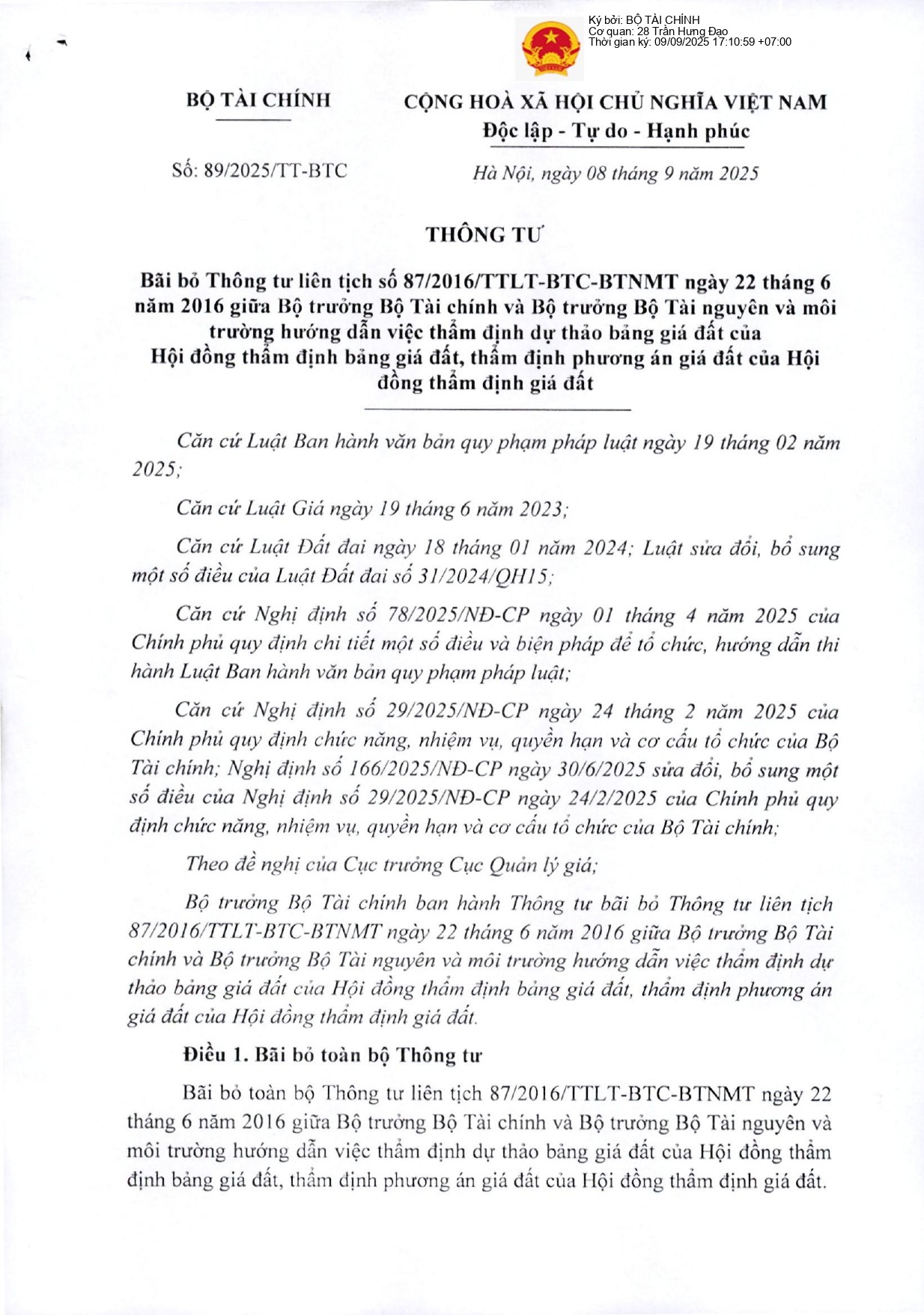 Được biết, Thông tư liên tịch 87/2016/TTLT-BTC-BTNMT là thông tư liên tịch ký giữa Bộ trưởng Bộ Tài chính và Bộ trưởng Bộ Tài nguyên và môi trường ngày 22/6/2016 hướng dẫn việc thẩm định dự thảo bảng giá đất của Hội đồng thẩm định bảng giá đất, thẩm định phương án giá đất của Hội đồng thẩm định giá đất.