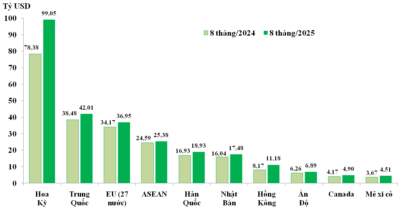 - Hoa Kỳ: trị giá xuất khẩu sang thị trường Hoa Kỳ trong 8 tháng/2025 đạt 99,05 tỷ USD, tăng tới 26,4%, tương ứng tăng 20,67 tỷ USD so với cùng kỳ năm trước và chiếm tới 32% trong tổng trị giá xuất khẩu của cả nước.