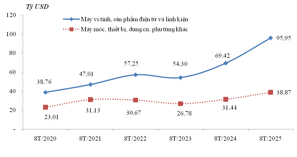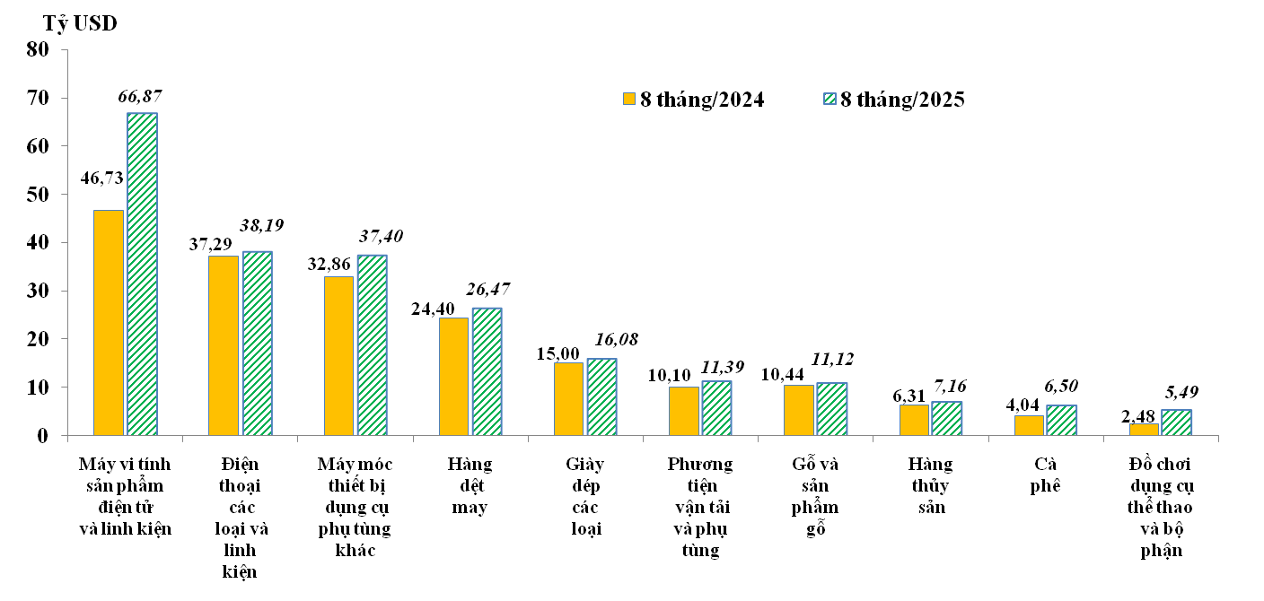 - Máy vi tính, sản phẩm điện tử và linh kiện: trị giá xuất khẩu nhóm hàng này trong tháng 8/2025 đạt 10,15 tỷ USD, qua đó nâng mức trị giá xuất khẩu trong 8 tháng/2025 đạt 66,87 tỷ USD, chiếm tới 22% tổng trị giá xuất khẩu của cả nước và tăng 43,1% (tương ứng tăng 20,15 tỷ USD) so với cùng kỳ năm trước.