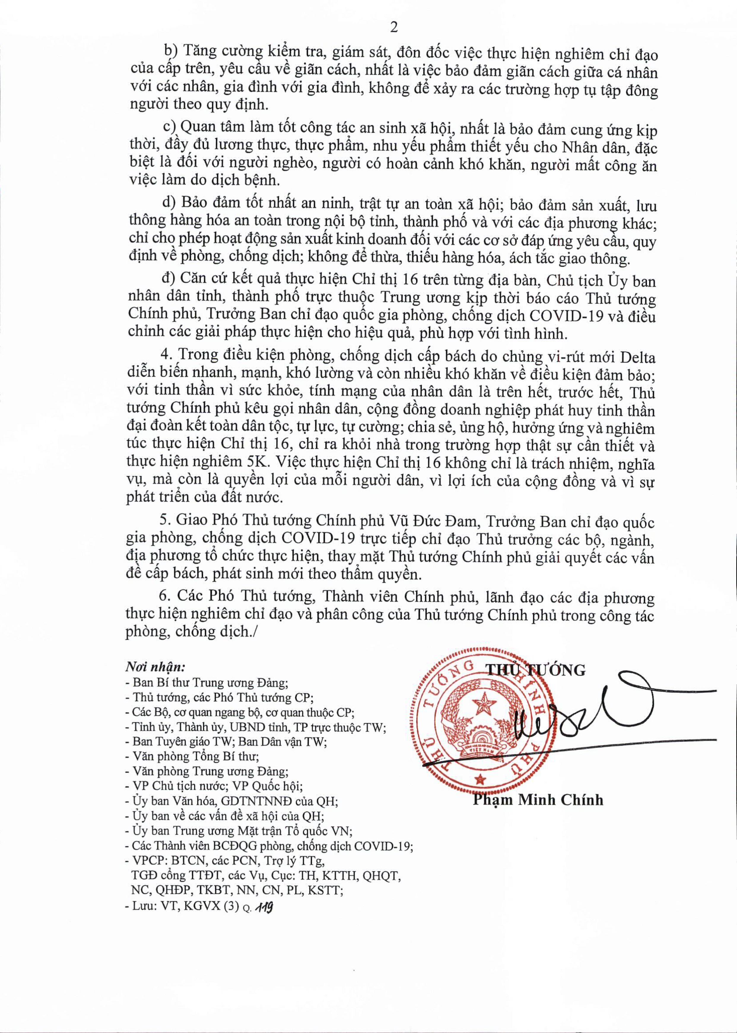 4. Trong điều kiện phòng, chống dịch cấp bách do chủng vi-rút mới Delta diễn biến nhanh, mạnh, khó lường và còn nhiều khó khăn về điều kiện đảm bảo; với tinh thần vì sức khỏe, tính mạng của nhân dân là trên hết, trước hết, Thủ tướng Chính phủ kêu gọi nhân dân, cộng đồng doanh nghiệp phát huy tinh thần đại đoàn kết toàn dân tộc, tự lực, tự cường; chia sẻ, ủng hộ, hưởng ứng và nghiêm túc thực hiện Chỉ thị 16, chỉ ra khỏi nhà trong trường hợp thật sự cần thiết và thực hiện nghiêm 5K. Việc thực hiện Chỉ thị 16 không chỉ là trách nhiệm, nghĩa vụ, mà còn là quyền lợi của mỗi người dân, vì lợi ích của cộng đồng và vì sự phát triển của đất nước.